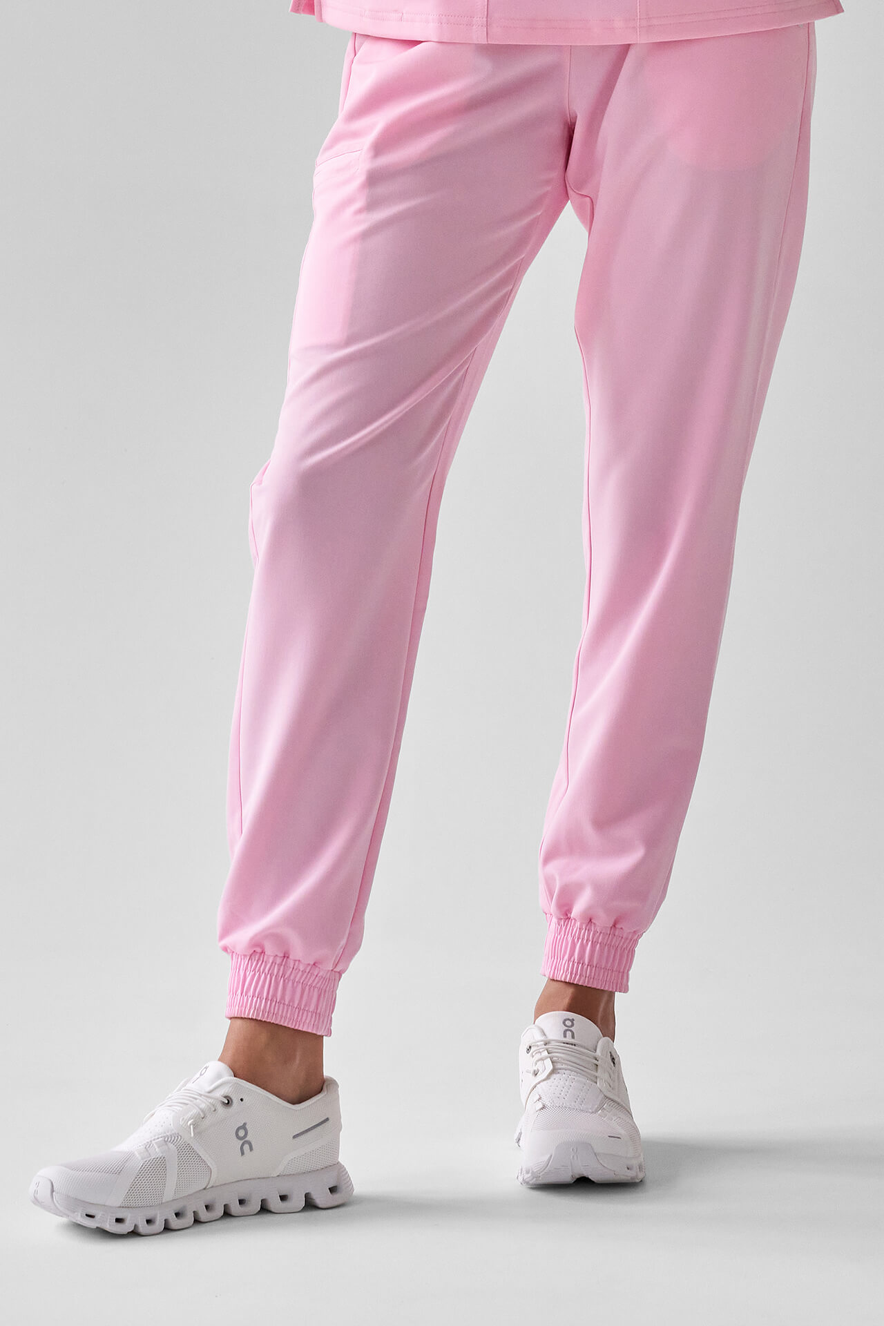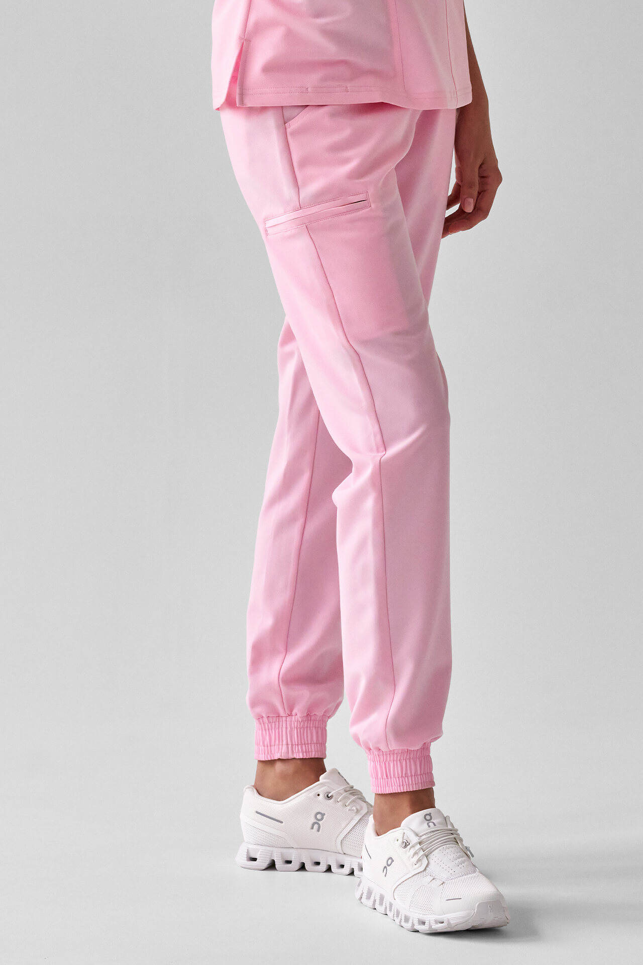 Miękki w wyrazie, ale mocny w przekazie. Kolor różowy sprawdza się w pracy, gdzie potrzebujesz delikatności z nutą profesjonalizmu – zarówno w klinikach estetycznych, jak i gabinetach lekarskich. Ten zestaw to balans pomiędzy kobiecą wrażliwością a siłą pewnych ruchów. Joggerowe spodnie ze sznurkiem do regulacji i bluza z dekoltem V tworzą wygodny, elastyczny duet, który pracuje razem z Tobą – od rana do wieczora.